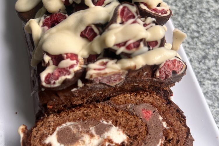 Este pionono helado es una locura absoluta: combina un interior marmolado de mousse de chocolate blanco y mousse de chocolate amargo, envuelto en un pionono suave y coronado con una montaña de frambuesas bañadas en chocolate tipo Franui.